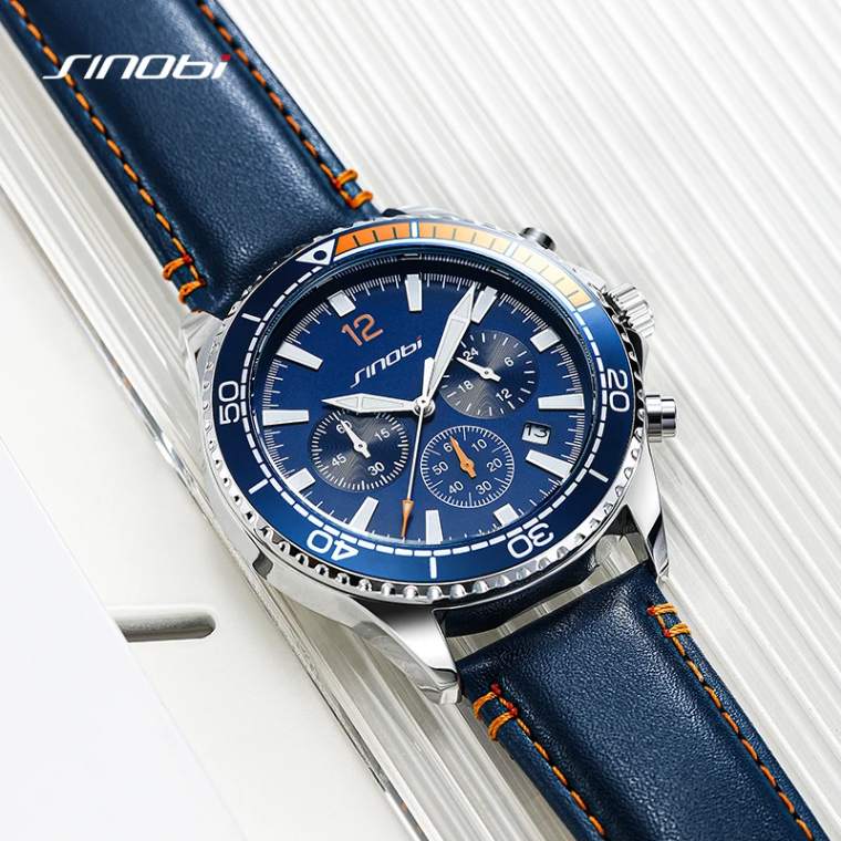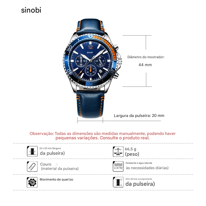 O relógio Sinobi 9866 é uma peça de estilo Fashion e Casual que combina a elegância do couro azul com um design esportivo vibrante. Este cronógrafo é alimentado por um movimento de Quartzo e oferece resistência e funcionalidade para o uso diário.