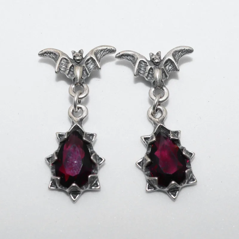 Liberte seu lado Punk, Gótico e Retro com estes impressionantes Brincos Pingentes. Apresentando um design de morcego no pino e uma pedra vermelha lapidada em forma de gota, estes brincos são o acessório perfeito para quem busca um estilo marcante e cheio de atitude.