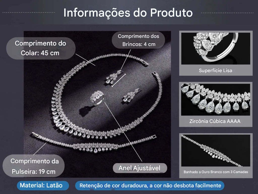 Este conjunto é um item de moda que utiliza diamante de zircônia cúbica 100% AAAA, garantindo um brilho superior e o reflexo de um diamante genuíno.
