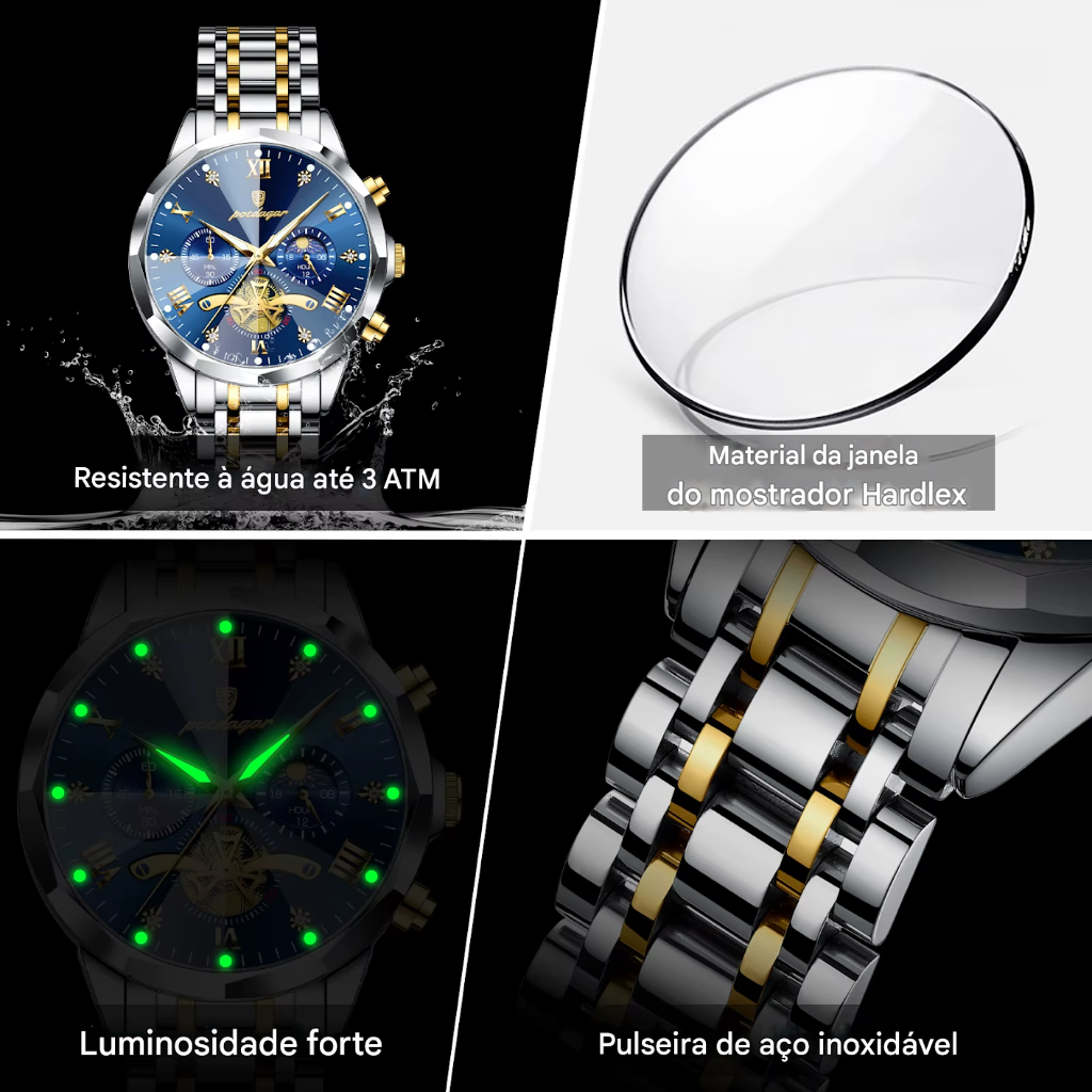 Embalagem Completa: O relógio é entregue com uma caixa POEDAGAR, ferramenta de ajuste de pulseira, lenço e cartão de garantia.