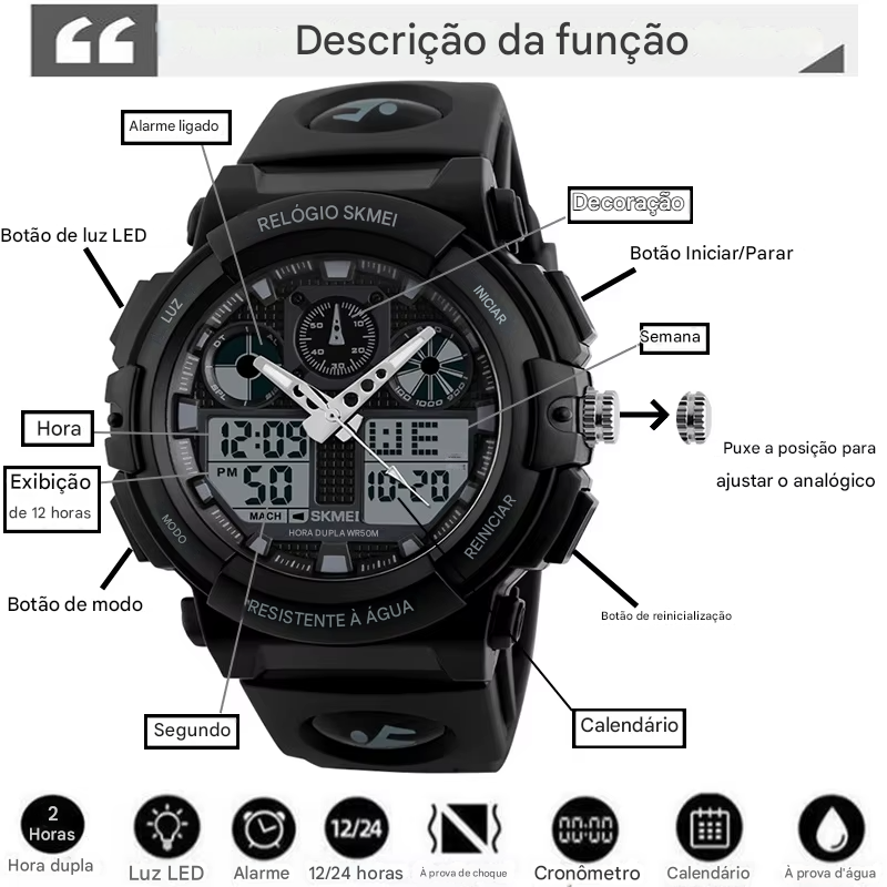 O Relógio SKMEI SK1270 é um acessório robusto e multifuncional, projetado para o estilo SPORT. Combinando um mostrador Analógico-Digital com uma impressionante lista de recursos, este relógio é o companheiro ideal para atividades ao ar livre e uso diário.
