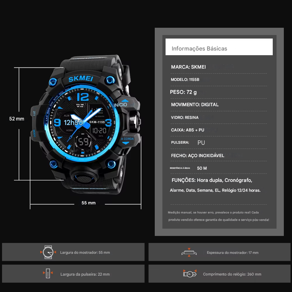 O SKMEI 1155B é a escolha ideal para quem precisa de um relógio esportivo com visual moderno, múltiplas funções e boa resistência à água.
