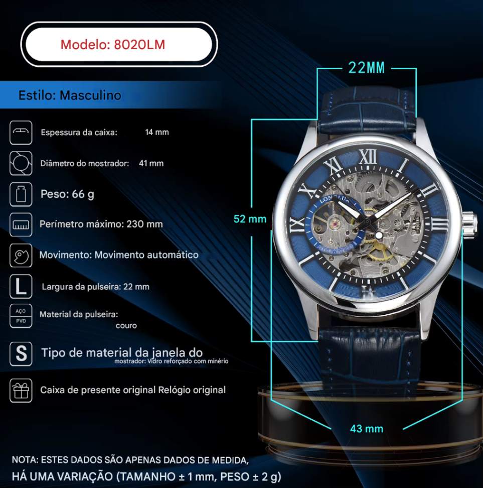O relógio LONGLUX 8020LM é uma peça de estilo Fashion e Casual que combina o charme da mecânica tradicional com um design moderno. Seu mostrador esqueleto revela o movimento complexo, tornando-o um acessório que une funcionalidade e fascínio visual.