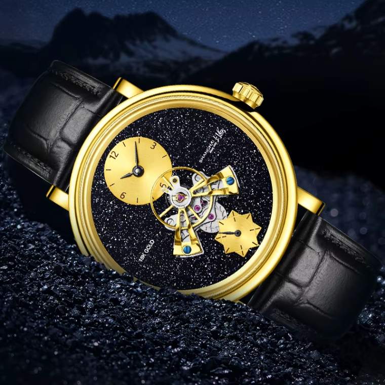 Turbilhão Central: O movimento Turbilhão, uma das complicações mais valorizadas na alta relojoaria, está posicionado de forma proeminente no centro, sobre um mostrador que simula um céu estrelado (Black sand/starry dial).