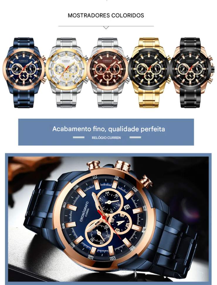 O relógio Curren 8361 é um cronógrafo masculino luxuoso e robusto, projetado para o estilo Fashion e Casual. Com uma pulseira de Aço inoxidável e um movimento de QUARTZ preciso, este relógio é um acessório de destaque para qualquer homem que aprecia relógios originais e de luxo.
